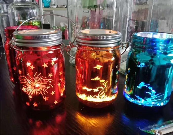 蒙砂酒瓶是在制品玻璃上,粘附一定大小面積的玻璃色釉粉,玻璃瓶廠經過580~600℃的高溫烘烤,使玻璃色釉涂層凝結在玻璃外表,并顯現出具有與玻璃主體不同顏色的一種裝飾辦法。粘附玻璃色釉粉,可用排筆涂刷,亦可用膠輥滾涂。經過絲印加工,能夠得到蒙砂面的樓空圖案。 其辦法是:在玻璃制品外表上,絲印一層由阻熔劑構成的圖案紋樣。